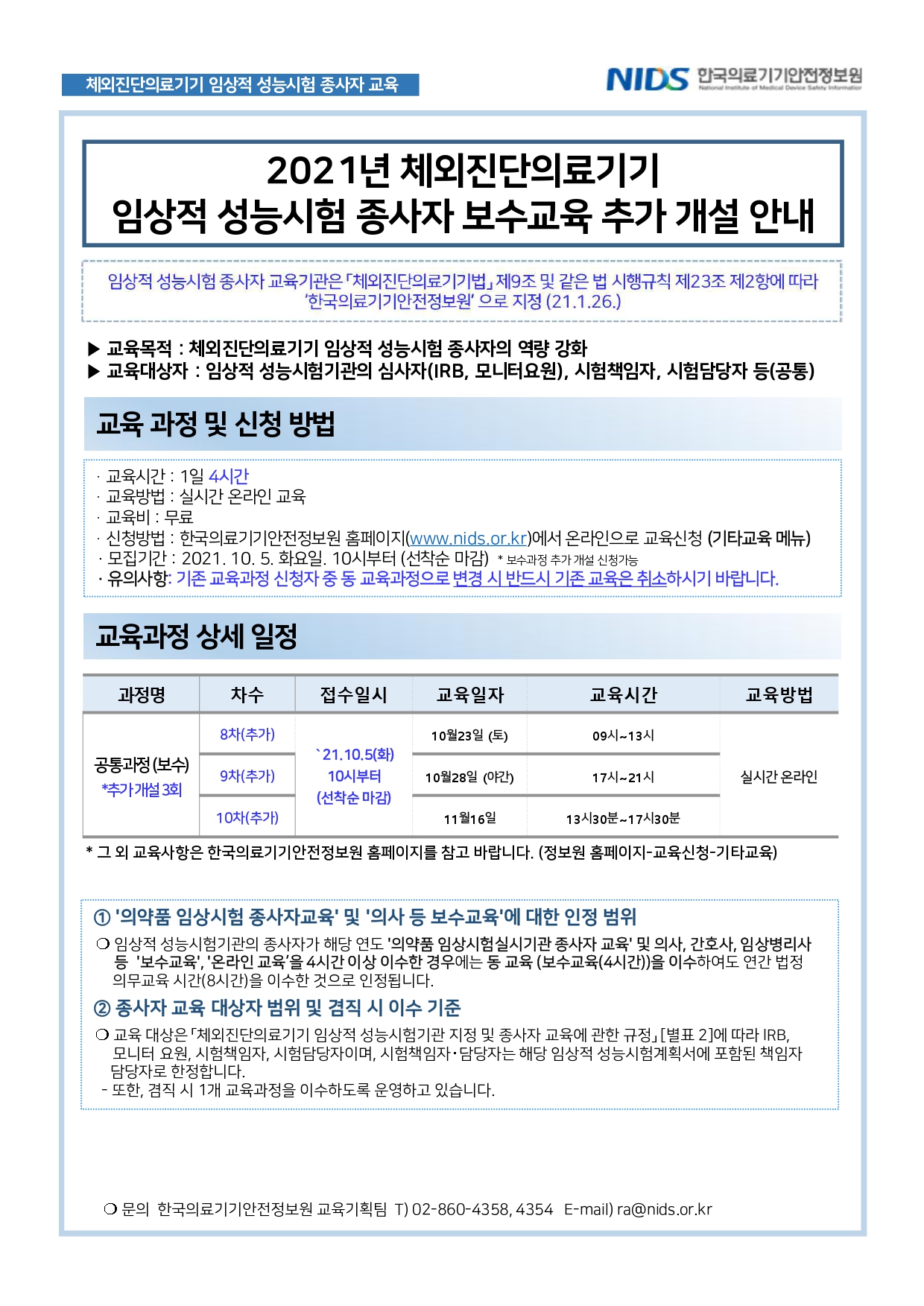 체외진단의료기기 임상적 성능시험 종사자 보수교육 추가개설 안내드립니다.