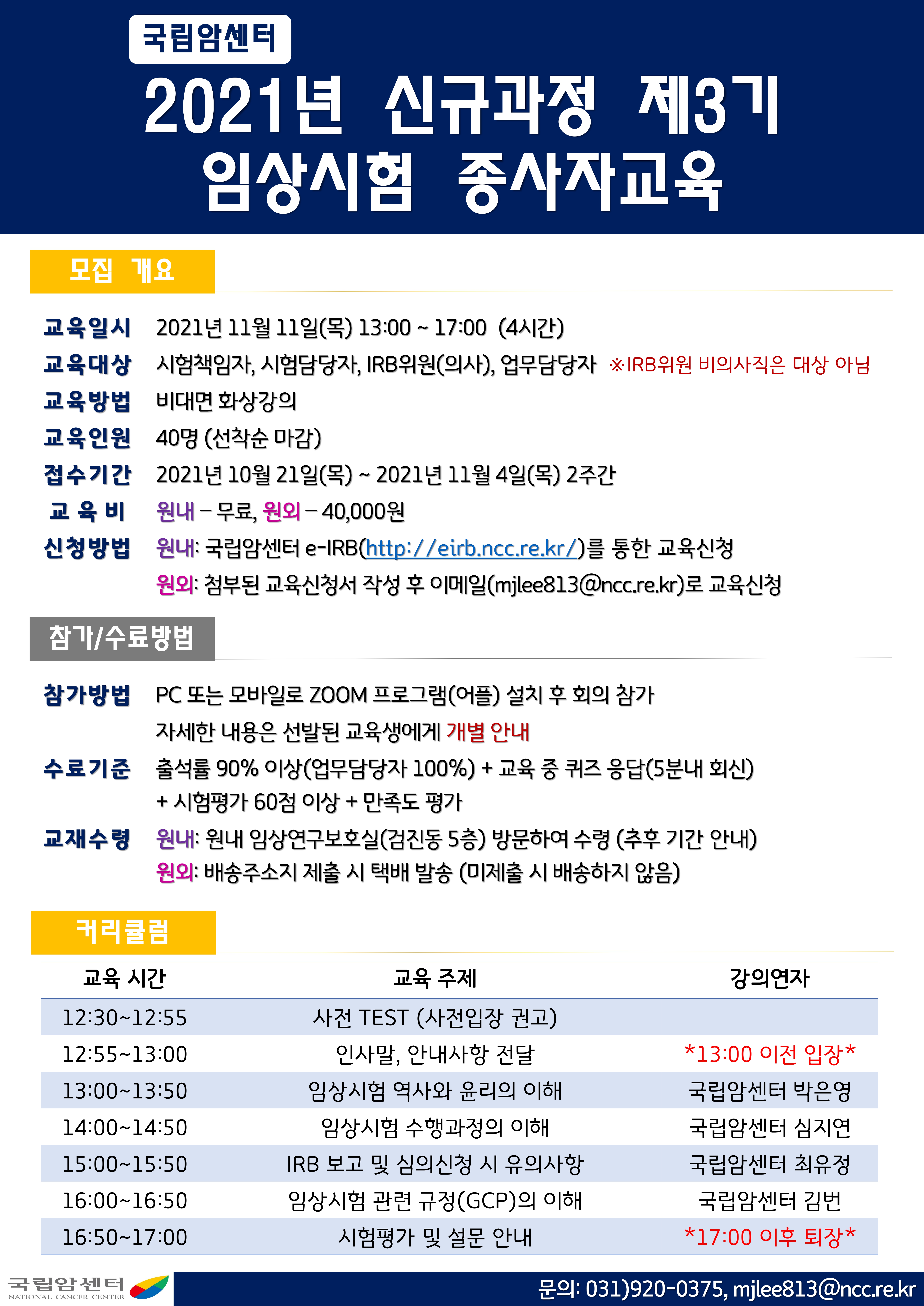 | [국립암센터] 2021년도 임상시험 종사자교육 보수과정 (11월 11일) 시행 안내 | ||