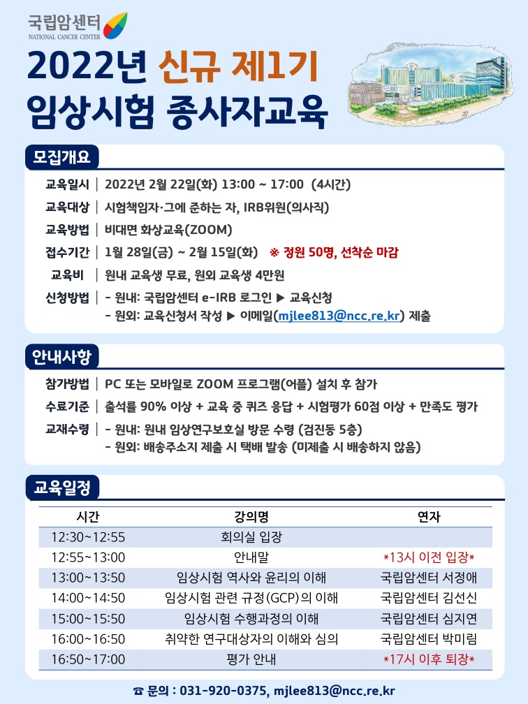 | [국립암센터] 2022년도 신규제1기 임상시험 종사자교육(2월 22일) 시행 안내 | |||