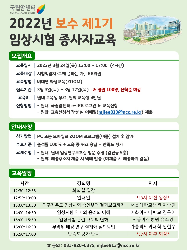국립암센터 "2022년도 보수제1기 임상시험 종사자교육" 시행 안내드립니다. 3월24일(목) 오후1시부터 비대면 화상교육(ZOOM)으로 임상시험 종사자교육을 실시합니다.