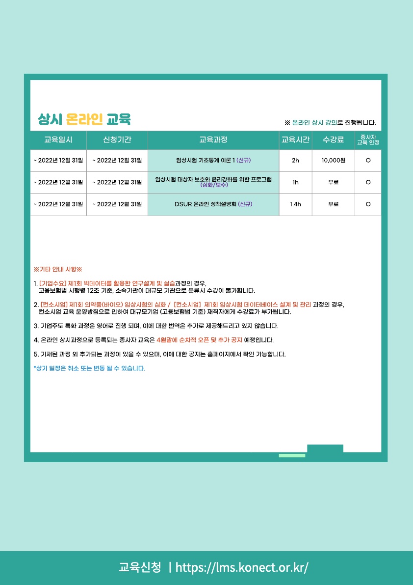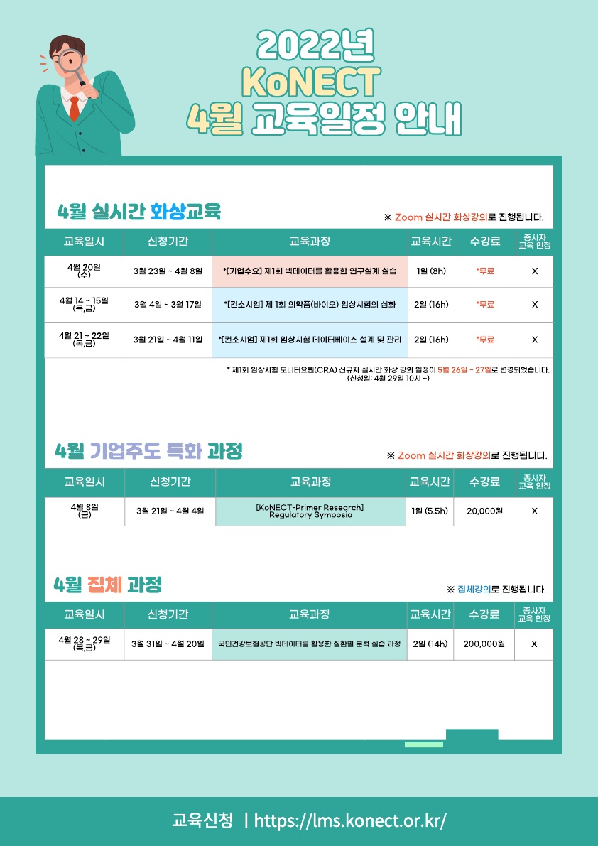 2022년 임상교육원에서 진행하는 4월 교육과정 안내 드립니다. ▼ 교육신청 바로가기 https://lms.konect.or.kr/web/index.do