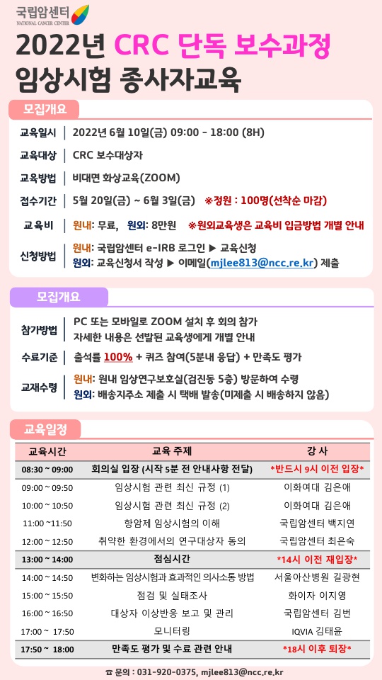 | [국립암센터] 2022년도 CRC 보수과정 임상시험 종사자교육 시행 안내(6월10일, 금) | ||