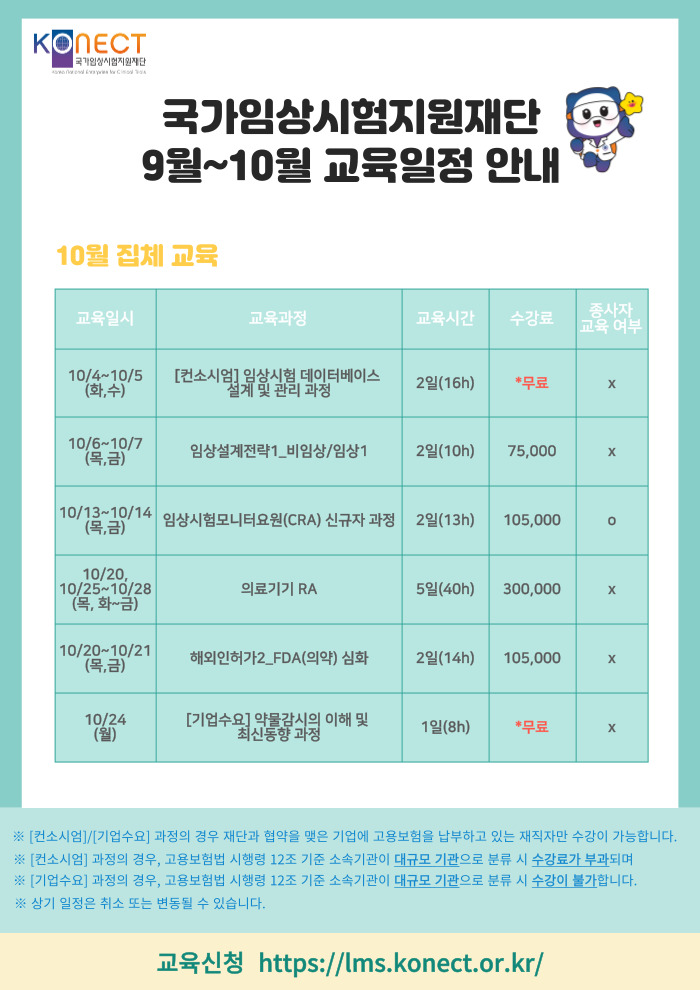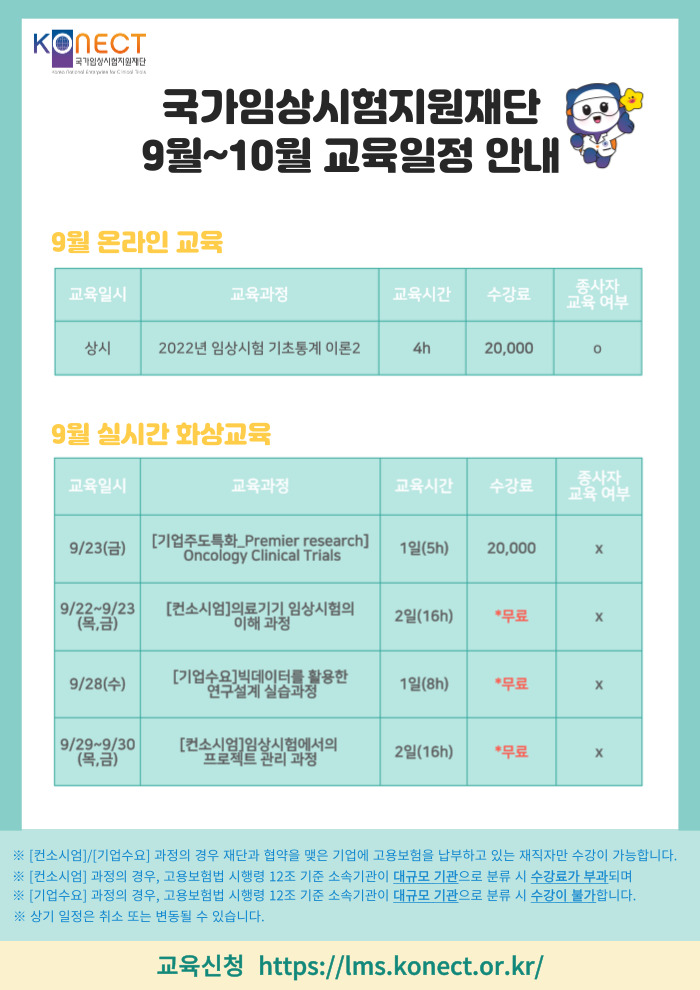 2022년 국가임상시험지원재단 임상교육원에서 진행하는 9-10월 교육과정 안내 드립니다.▶ 교육신청 바로가기 ◀많은 관심과 참여 부탁드립니다.*하단의 이미지를 확인하여 주시기 바랍니다.