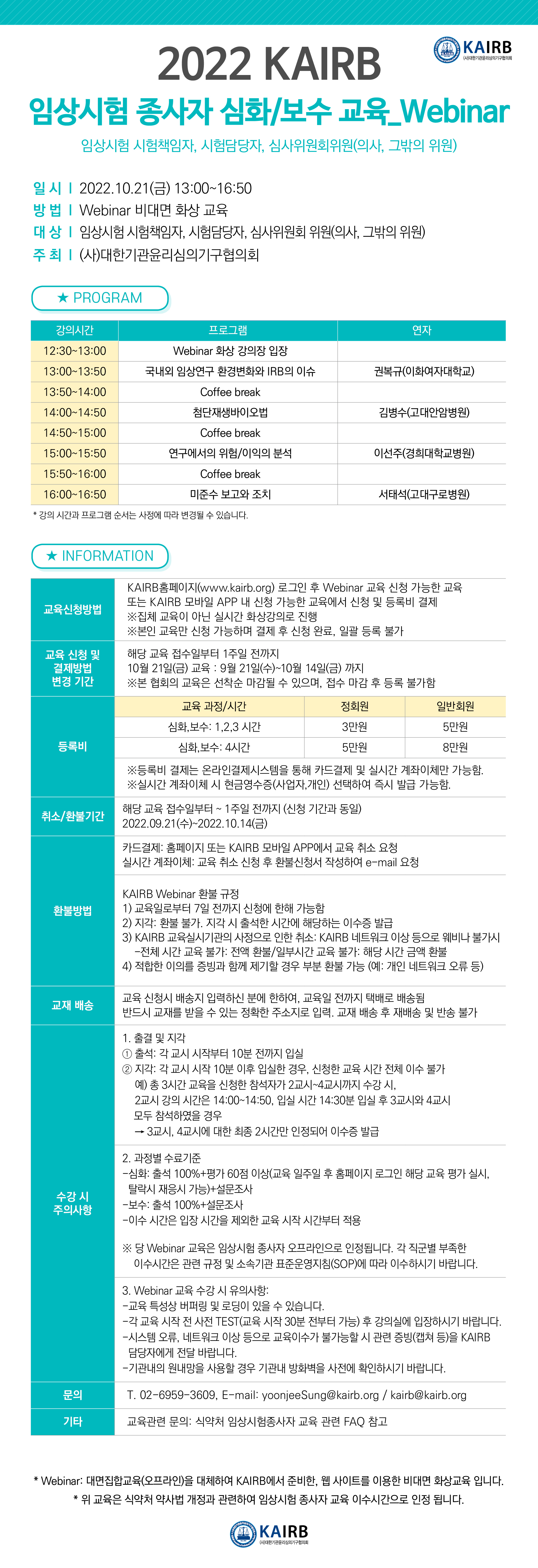 [KAIRB] 10/21(금) 2022 임상시험 종사자 심화/보수 교육 신청 안내_Webinar