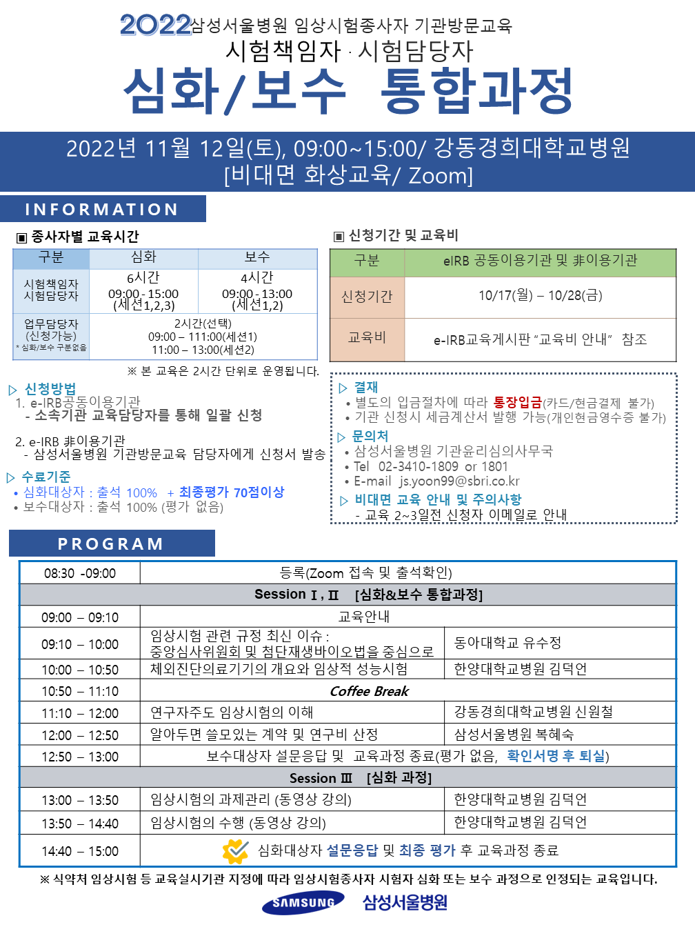 임상시험종사자교육 『시험자책임자·시험담당자·업무담당자 - 심화&보수교육』 11/12(토),