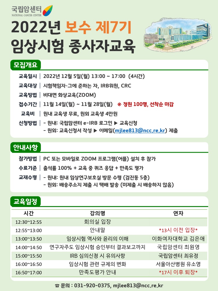 국립암센터 "2022년도 임상시험 종사자교육 보수과정" 시행 안내드립니다. 12월5일(월) 오후1시부터 비대면 화상교육(ZOOM)으로 임상시험 종사자교육을 실시합니다. 자세한 사항은 아래 포스터를 확인해주시고 교육 신청을 원하시는 분은 첨부된 교육신청서를 작성하시어 본 메일(mjlee813@ncc.re.kr)로 회신 주시기 바랍니다. ※ 본 교육과정은 보수과정 4시간으로 부분 이수하실 수 없습니다. ※ 첨부된 교육신청 서 내 개인정보동의서는 반드시 자필로 서명 후 스캔하여 제출하셔야 합니다. ※ 교육비 입금은 교육신청서 제출 후 2-3일 내에 선발된 대상자에게 입금 안내메일을 드립니다. (카드 결제X, 계좌 입금O) ※ 해당 공지사항은 https://ncc.re.kr/eduboard.ncc?uri=edubbs016 에서도 확인하실 수 있으니 참고바랍니다. |