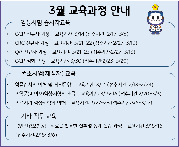 국가임상시험지원재단 임상교육원입니다.2023년 임상교육원에서 진행하는 3월 교육 안내 드립니다.