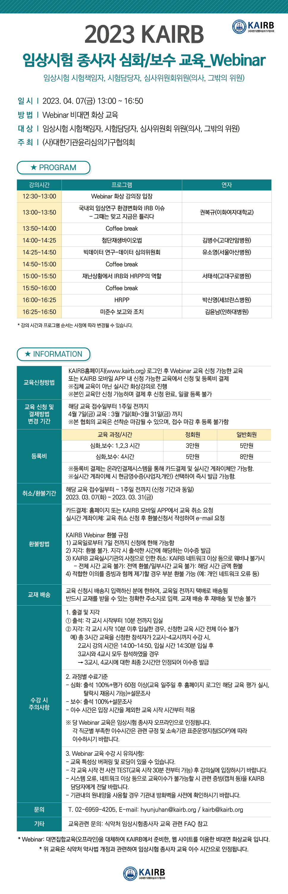 [KAIRB] 4/7(금) 2023 임상시험 종사자 심화/보수 교육 신청 안내_Webinar