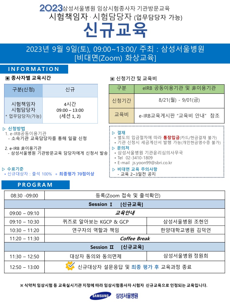 임상시험종사자교육 『시험자책임자·시험담당자 - 신규교육』 9/9(토), 삼성서울병원 교육을 아래와 같이 개최하오니 많은 관심과 참석을 바랍니다.