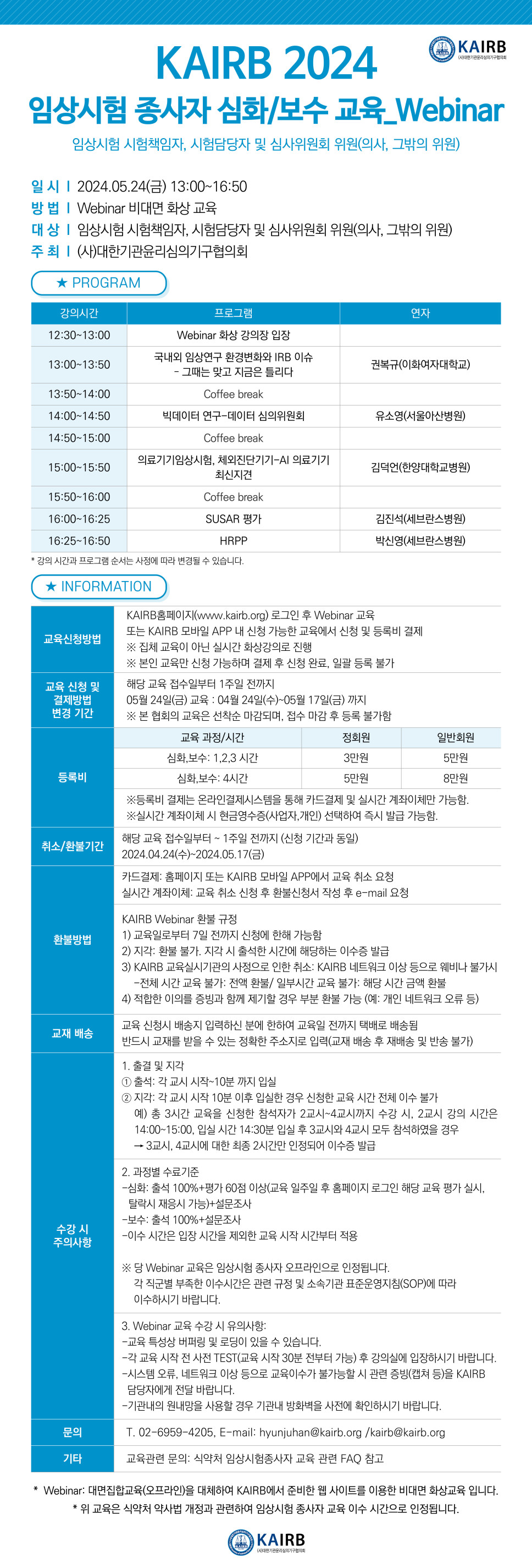 [KAIRB] 5/24(금) 2024 임상시험 종사자 심화/보수 교육 신청 안내_Webinar