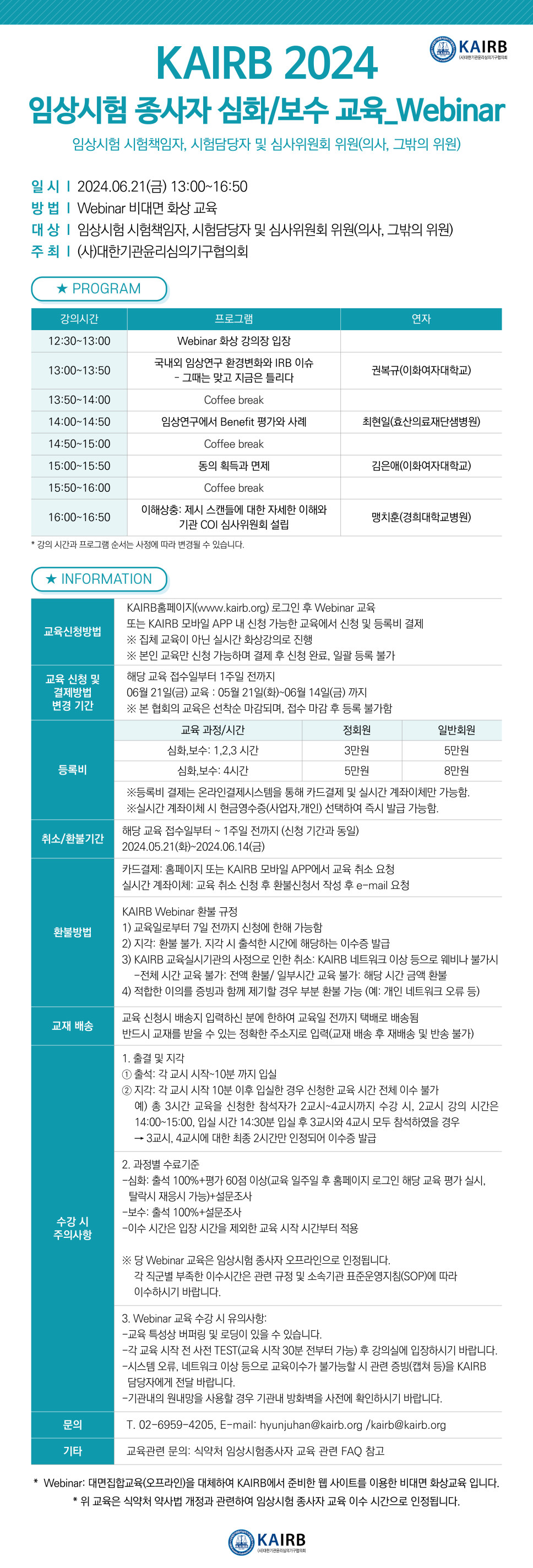 [KAIRB] 6/21(금) 2024 임상시험 종사자 심화/보수 교육 신청 안내_Webinar