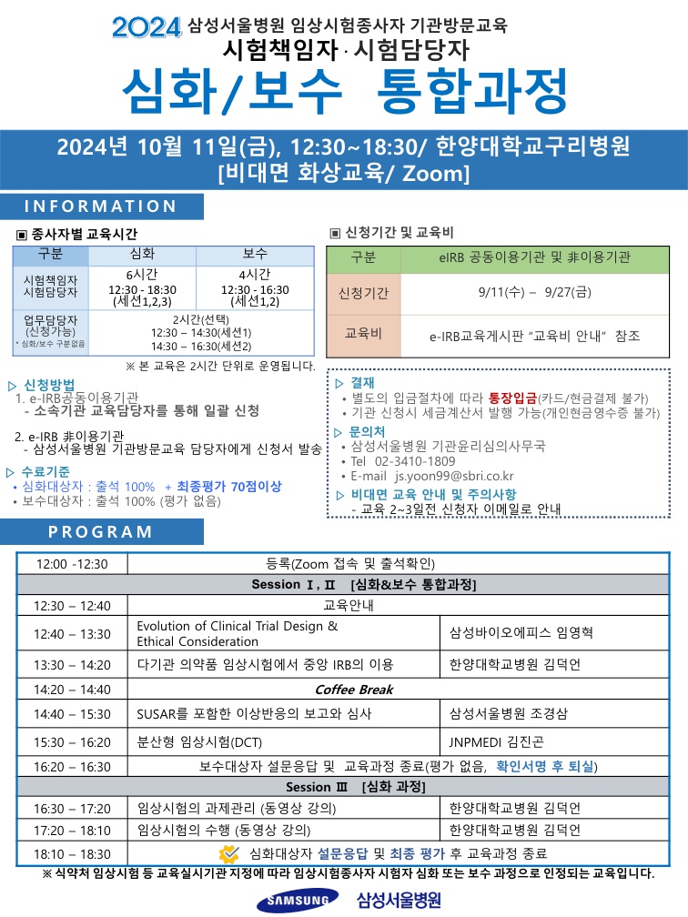임상시험종사자교육 『시험자책임자·시험담당자·업무담당자 - 심화&보수교육』 10/11(금), 한양대학교구리병원 교육을 아래와 같이 개최하오니 많은 관심과 참석을 바랍니다. 신청서(동의서) 및 신청자명단을 작성하신 후 아래 신청기간을 참고하셔서 메일(js.yoon99@sbri.co.kr)로 회신하여 주시기 바랍니다. - 신청기간 : ~ 9/27(금) 신청기한을 준수 바랍니다.