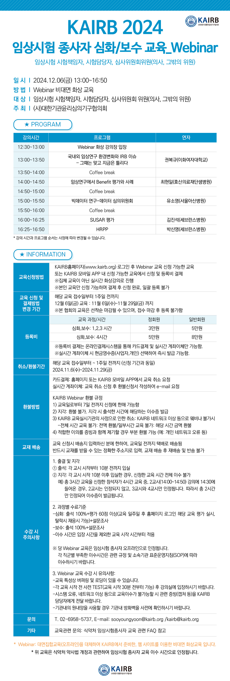 [KAIRB] 12/6(금) 2024 임상시험 종사자 심화/보수 교육 신청 안내_Webinar
