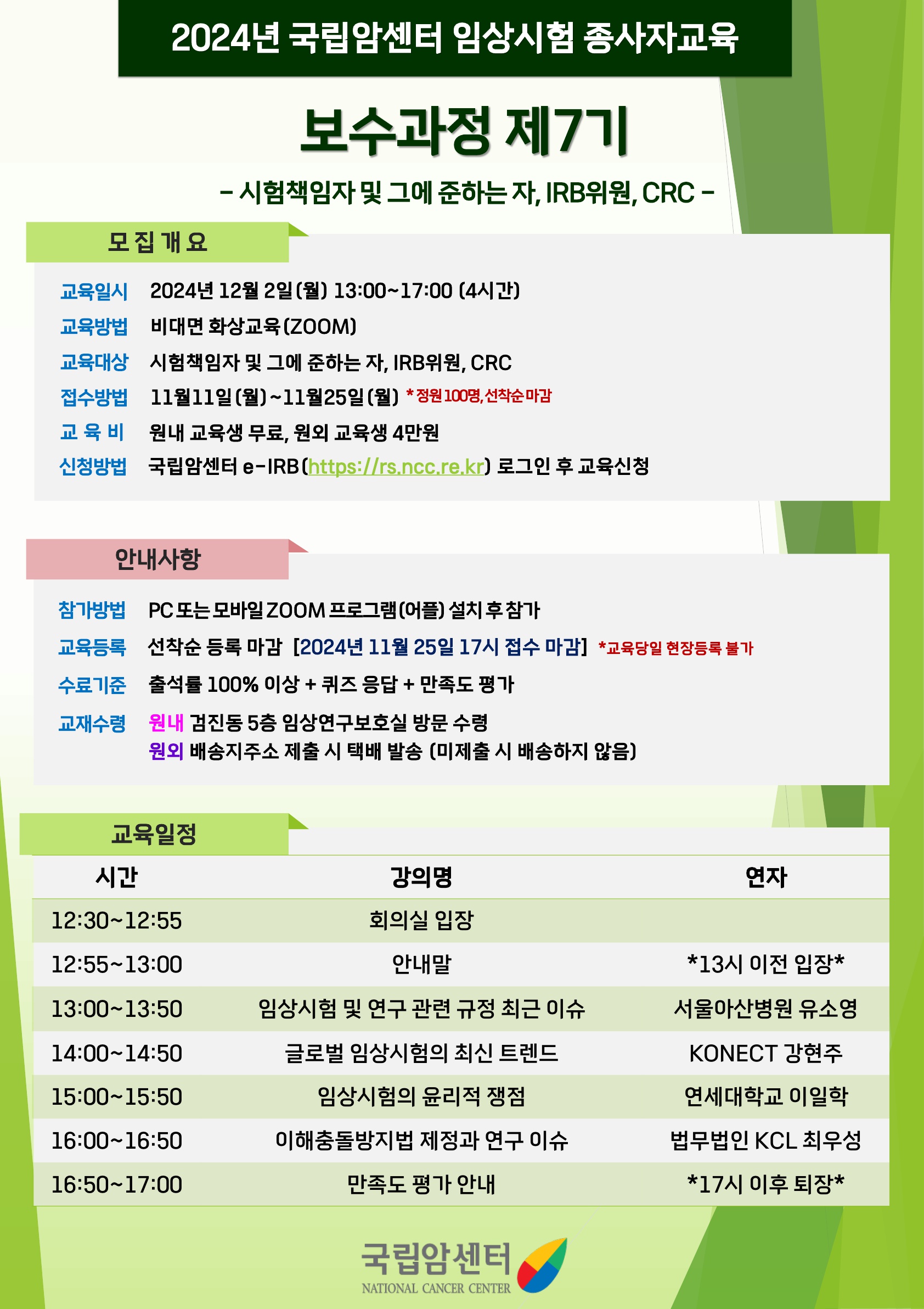 안녕하세요 국립암센터 임상연구보호실입니다. 국립암센터에서 12월2일(월) 임상시험 종사자교육 보수과정을 실시할 예정이오니 관심있는 분들의 많은 신청바랍니다. ■ 교육일시: 2024.12.02.(월) ■ 신청기간: 2024.11.11.~2024.11.25. 17:00 **선착순 마감 ■ 신청방법: 국립암센터 연구심의지원 통합시스템(https://rs.ncc.re.kr) 로그인 → 교육/연구이력 → 교육안내 ■ 교육대상: 시험책임자 및 그에 준하는 자, IRB위원, CRC