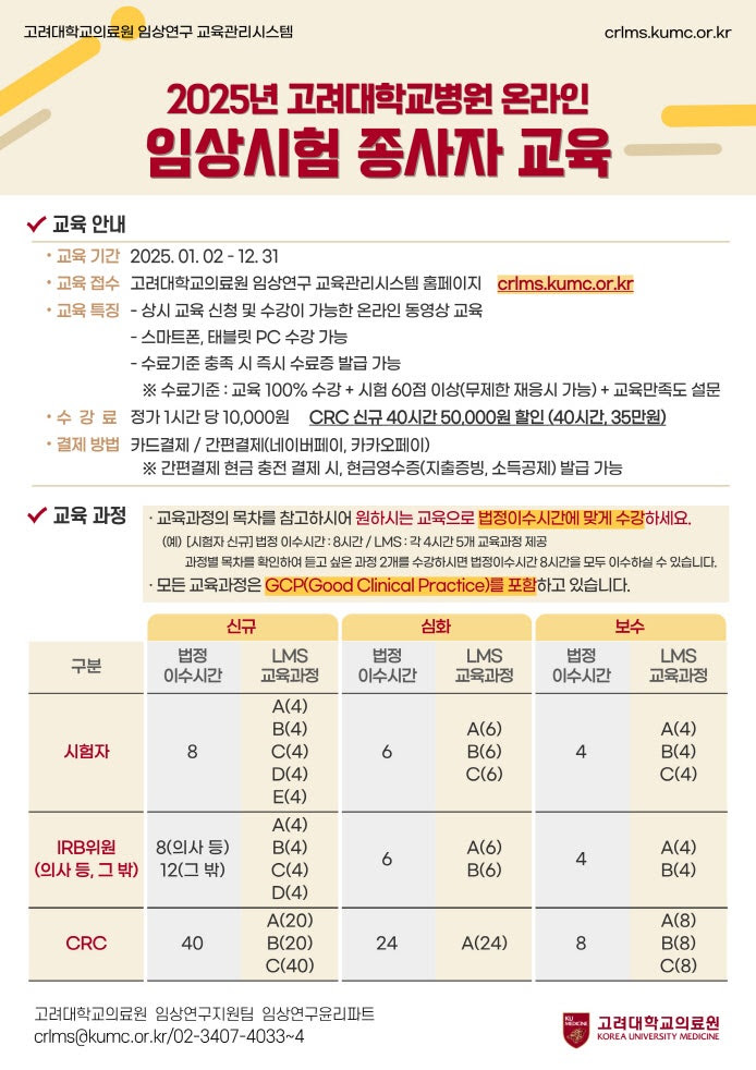 | [고려대학교의료원] 2025년 임상시험 종사자 교육(온라인) 시행 안내 | ||
