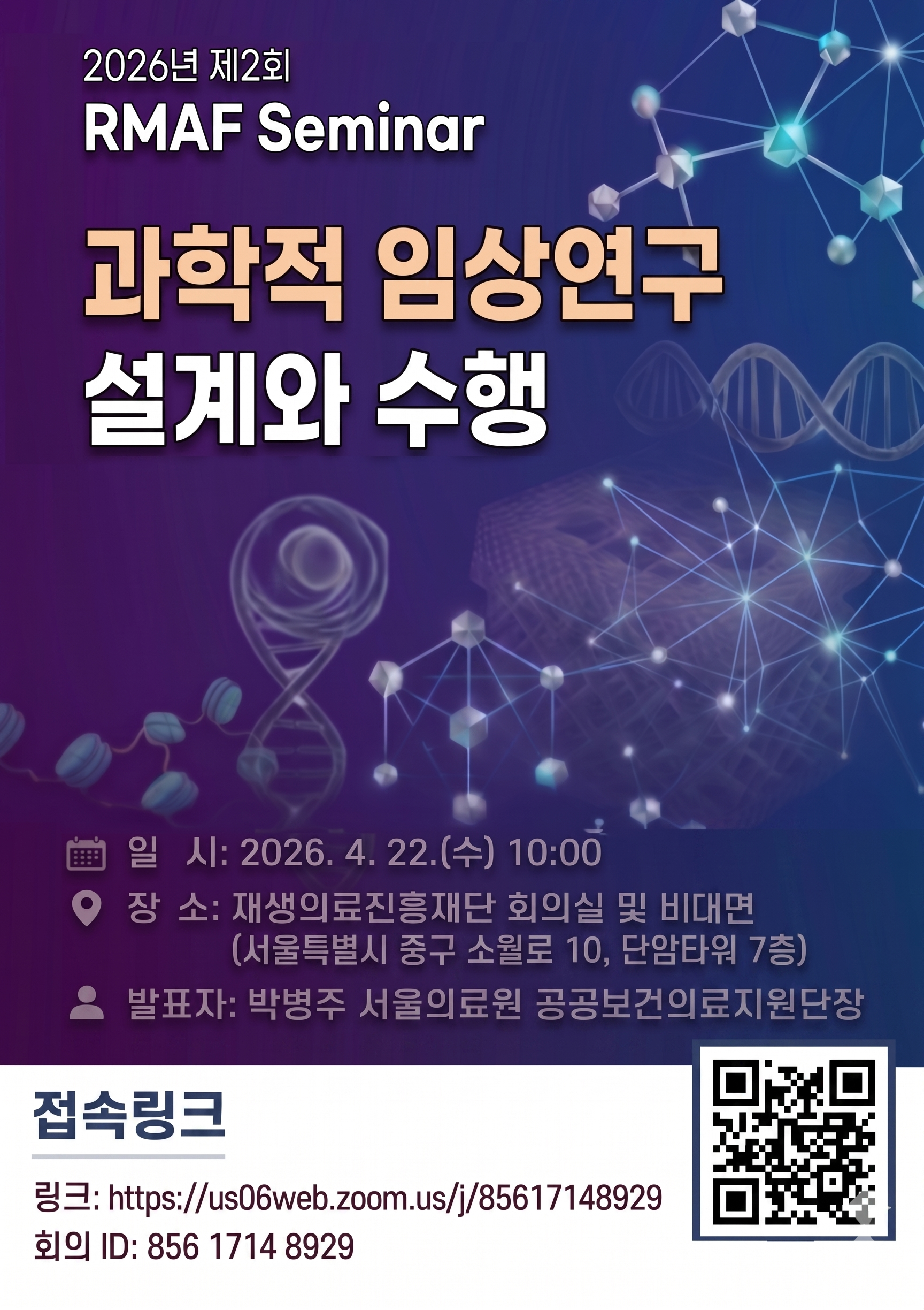 재생의료진흥재단에서 "과학적 임상연구 설계와 수행"을 주제로「2026년 제2회 RMAF Seminar」를 개최할 예정입니다. 박병주 서울의료원 공공보건의료지원단장님께서 직접 강연을 진행해주실 예정이오니, 많은 참석과 홍보를 요청 드립니다.